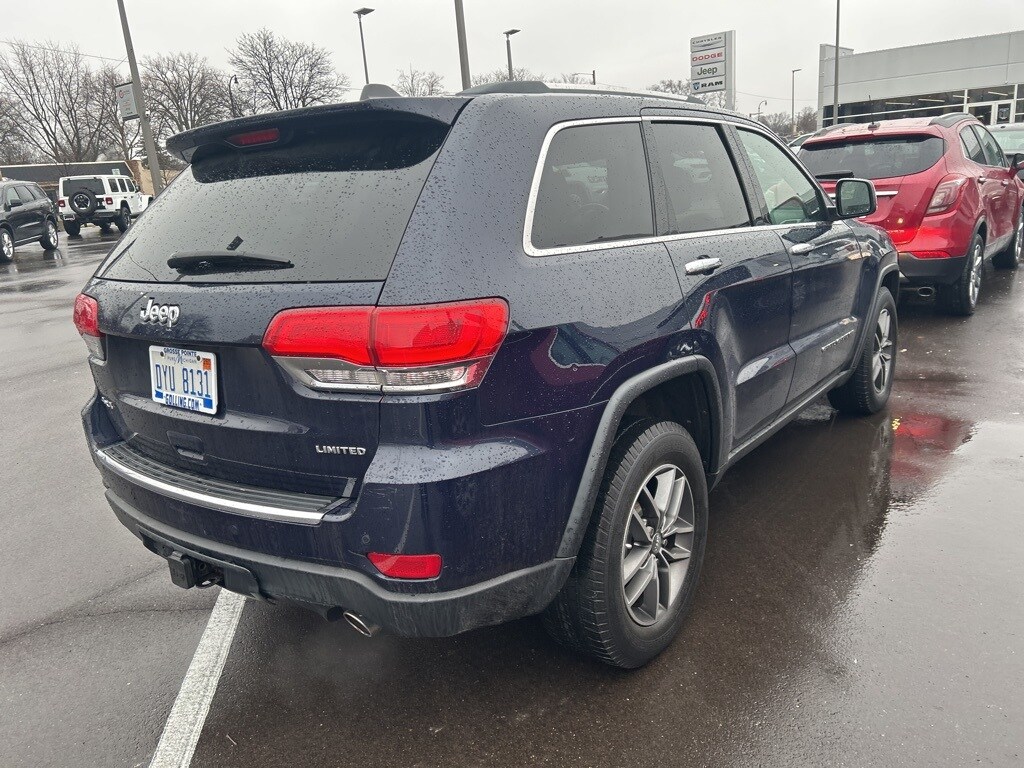 The all new Golling CDJR of Grosse Pointe is pumped up to offer this 2018 Jeep Grand Cherokee Limited in True Blue Pearlcoat with Black Leather. This Grand Cherokee is very well equipped with Quick Order Package 2BH, Trailer Tow Group IV (7 & 4 Pin Wiring Harness, Class IV Receiver Hitch, Heavy-Duty Engine Cooling, and Rear Load Leveling Suspension), 1-Year SiriusXM Guardian Trial, 3.45 Rear Axle Ratio, 4-Wheel Disc Brakes, 5-Year SiriusXM Traffic Service, 5-Year SiriusXM Travel Link Service, 6 Speakers, 8.4" Touchscreen Display, ABS brakes, Air Conditioning, Alloy wheels, AM/FM radio: SiriusXM, Anti-whiplash front head restraints, Apple CarPlay, Apple CarPlay/Android Auto, Audio memory, Auto-dimming door mirrors, Auto-Dimming Exterior Passenger Mirror, Auto-dimming Rear-View mirror, Automatic temperature control, Blind Spot & Cross Path Detection, Brake assist, Bumpers: body-color, Chrome Exterior Mirrors, Compass, Delay-off headlights, Driver door bin, Driver vanity mirror, Dual front impact airbags, Dual front side impact airbags, Electronic Stability Control, Engine Oil Cooler, For Details Visit DriveUconnect.com, Four wheel independent suspension, Front anti-roll bar, Front Bucket Seats, Front Center Armrest w/Storage, Front dual zone A/C, Front fog lights, Front reading lights, Fully automatic headlights, Garage door transmitter, Google Android Auto, GPS Antenna Input, GPS Navigation, HD Radio, Heated door mirrors, Heated front seats, Heated rear seats, Heated steering wheel, Illuminated entry, Integrated Voice Command w/Bluetooth, Knee airbag, Leather Shift Knob, Leather Trimmed Bucket Seats, Low tire pressure warning, Memory seat, Normal Duty Suspension, Occupant sensing airbag, Outside temperature display, Overhead airbag, Overhead console, Panic alarm, ParkView Rear Back-Up Camera, Passenger door bin, Passenger vanity mirror, Power door mirrors, Power driver seat, Power Liftgate, Power passenger seat, Power steering, Power Sunroof (DISC), Power windows, Radio data system, Radio: Uconnect 4 w/7" Display, Radio: Uconnect 4C Nav w/8.4" Display, Rear anti-roll bar, Rear reading lights, Rear seat center armrest, Rear window defroster, Rear window wiper, Remote keyless entry, Roof rack: rails only, Security system, SiriusXM Traffic Plus, SiriusXM Travel Link, Speed control, Speed-Sensitive Wipers, Split folding rear seat, Spoiler, Steering wheel mounted audio controls, Tachometer, Telescoping steering wheel, Tilt steering wheel, Traction control, Trip computer, Turn signal indicator mirrors, USB Host Flip, Variably intermittent wipers, and Wheels: 18" x 8.0" Tech Gray Aluminum.